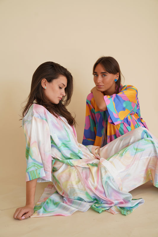 აბრეშუმის საღამური ფერადი ორნამენტებით